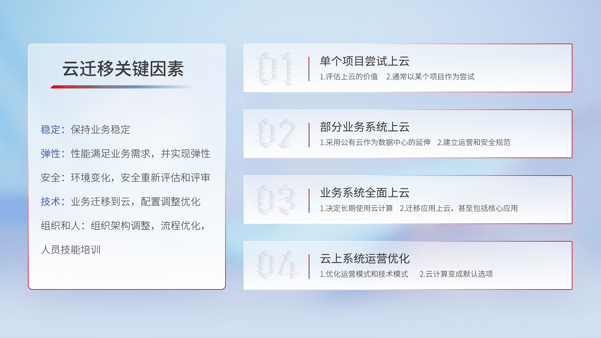 结合实际业务,,,,从规划设计、、、云平台选型、、、、云原生改造、、、、数据迁移、、、集成交付,,,迁移全过程为客户识别最佳上云路径,,做好风险识别管理,,,设计网络架构、、身份权限、、安全审计合规、、操作审计、、、、日志审计、、、、监控告警策略、、多站点容灾设计等,,,,对云上基础设施进行整体规划,,提升IT治理水平,,,,以满足弹性、、、高可用、、、、高性能的需求。。