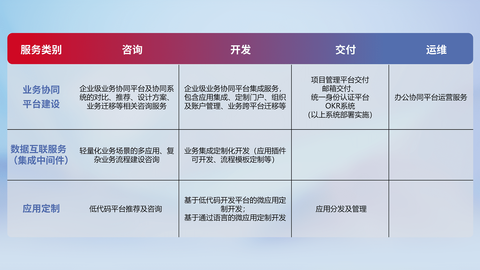 针对钉钉、、、、企微、、、、IDaas等平台级产品提供产品的规划、、方案、、、交付、、、、定制化开发等服务,,实现如统一协同办公、、智能客户服务、、、混合会议管理、、、智能数据查询、、等业务场景,,,实现数字化转型。。